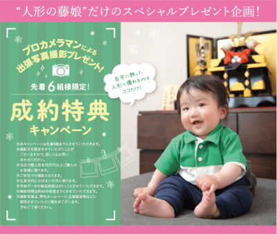 人形の藤娘では現在、「成約特典キャンペーン」を開催中!五月人形や兜飾り、鯉のぼりなど、20万円以上購入の方(先着6名)に出張写真撮影をプレゼント♪