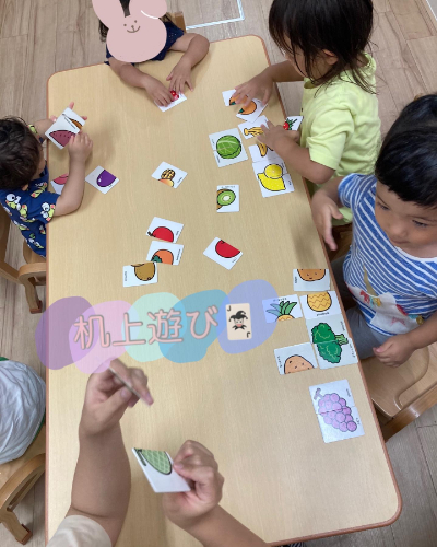 おりがみ保育園では、両園とも保育時間内に英語フラッシュカードなどを使った知育タイムを導入