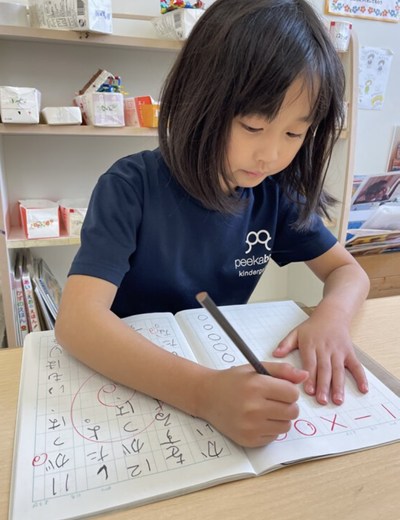 年長クラスになると、硬筆教室も実施。硬筆用の鉛筆とノートを使って、鉛筆の持ち方から書き順まで丁寧に指導します。ピーカブー幼稚舎では「正しく書く」ことよりも、文字への興味や、書くことの楽しさを実感できるようサポート。「小学校に上がったときに、スムーズに授業に入りやすいのでは」と田上先生は話していました。