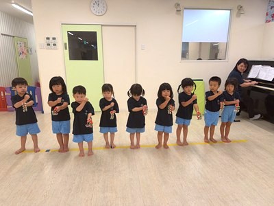 フープなどの教具や、カスタネット、すずなどのさまざまな楽器に触れながら、その子なりの表現を大切にしているのも特徴。年長クラスは合奏もあり、お友だちと活動する楽しさも味わえます。