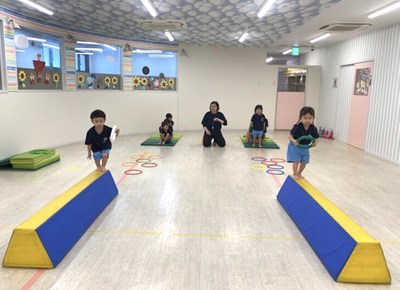 体操では、走る・跳ぶ・登る・転がるなどの基礎的な動きを土台に、鉄棒や跳び箱、ボールあそびなどさまざまな運動にも挑戦。
