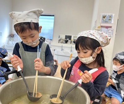 クッキング保育は、年少クラスから月1回実施。作った料理を昼食やおやつとして味わい、「自分で作ったものを食べる」喜びを大切にしています。