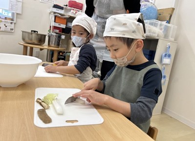 調理器具を使う中で危険を察知する力や、作ってくれる人への感謝の気持ちなど、育てたい力は多岐にわたります。季節行事と結びついたメニューも多く、包丁の扱いや調理方法など、3年間でできることが着実に増えていくのも特徴です。