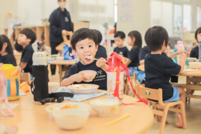 出汁と素材の味にこだわったおいしい給食は、子どもたちがとても楽しみにしています。出汁は一からきちんと取ったもので、砂糖には優しい甘さのきび砂糖を使用。園庭で育てているキュウリやナスなどの野菜が材料になることも。なんとおやつも手作りです。