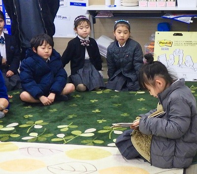 こちらは、1年生の1日の終わりの1コマ。毎日1日の終わりに、1人ずつクラスメートに本を読んで聞かせているそう。
