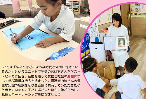 さらにAIC国際学院大阪 初等部では、学校内だけで完結するのではなく、保護者の協力も積極的に得て、学校と家庭が連携を取りながら教育を行っているのも特徴です。写真は、2年生の児童の祖母を招いて行われた特別授業でのひとコマ。結婚の話を通して、女性と社会の関わりや、その変化について学んだそう。