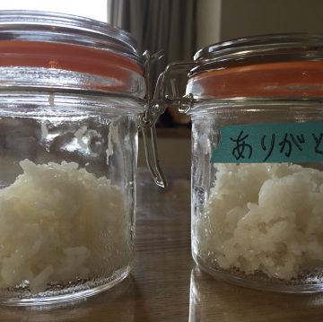 まったく同じ瓶を2つ用意し、同じように消毒します。我が家は大きなお鍋に2つ同時に入れて煮沸消毒しました。そしてその瓶の中に、炊いたお米を同じ量入れます。全く同じ条件のものを2つ用意するのです。