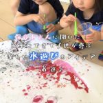 ペットボトルやプラスチックのコップに絵の具を入れて、色水作り。「この色とこの色を混ぜたらどんな色になるんだろう」と子供の好奇心をくすぐります。