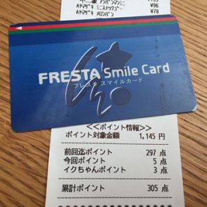 実は、フレスタのお店でイクちゃん画像を提示し、「フレスタ子育て応援イクちゃんサービス会員」に登録すると、お買い物1回につき、スマイルカードポイントが3ポイントプラスで加算!カードを提示して買い物をすると、自動的にポイントがプラスされ、レシートに印字されています。何円以上、月に何回までなどの制限も特にないのがうれしいところ。その上、18歳未満の子どもまでOKと、子育て支援としては年齢幅が広いのもポイントです。