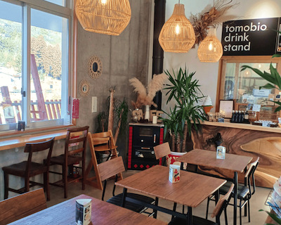 「Tomobio drink stand」(トモビオ ドリンク スタンド)は、遊びも食事も宿泊もお任せの2021年にオープンした複合施設、トモビオパーク・里の駅にあるカフェです。店内で手作りしたピザや広島県熊野町のブランド牛を使ったハンバーガーなど、魅力的なランチがいただけます。また、オリジナルのスペシャリティコーヒー「トモビオブレンド」や生乳ソフトなど、カフェメニューも充実。お腹を満たしたいときにも、ほっと一息つきたいときにもぴったりのカフェです♪