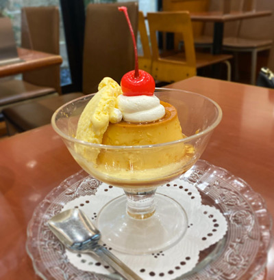 レトロな雰囲気の中でプリンを楽しむ「フルフル」【広島市中区】