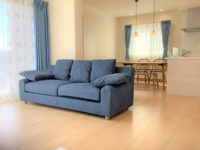 リビングは、ホワイトとブルーを基調にした、ナチュラルテイストの温もりあふれる空間。家族みんながリラックスするのにぴったりです。窓から日差しがたっぷり入ってくるのでとっても明るいのも魅力的。一角には置き畳のスペースもあります。