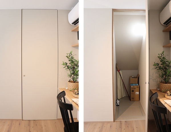 大之木ダイモのモデルハウスは、収納がたくさんあるのも魅力♪WICやパントリーのほかに、階段下収納も付いています。掃除道具や買いだめした日用雑貨などは階段下収納にしまっておけるので、いつでも家の中がスッキリ片付きます。