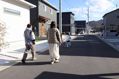 「グランディール西条」は、全80区画の広々とした分譲地。道幅も6mと広く、分譲地内は交通量が少ないため、子育て世代が安心して暮らせる環境です。取材当日には自転車の練習をする姿も♪