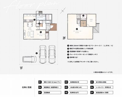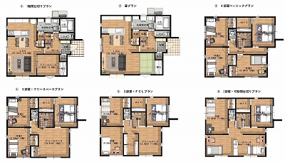こちらは、基本プランからの変更例。①や②のように、リビング横のフリースペースを扉で仕切ったり畳スペースにしたり、自由に変更できます。