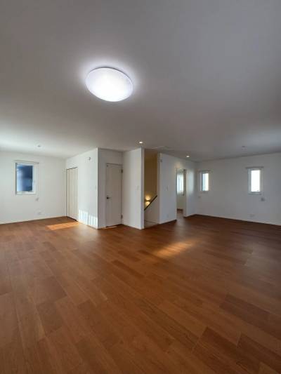 こちらは2階のフリースペース。奥の寝室以外はあえて間仕切りを設けていない、開放的な空間です。図面や写真だけではイメージしづらいサイズ感や動線、光の入り方を実際に体感しながら間取りを決められるのは、分譲・建売住宅にはない大きな魅力。