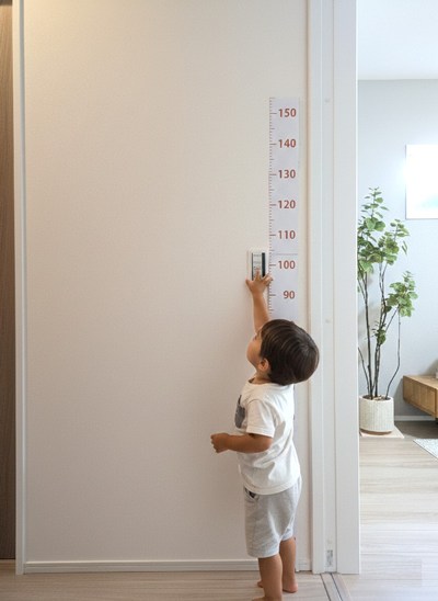 盲点になりがちなスイッチの位置も、しっかりママ目線。一般的なスイッチは床から約120cmの高さに設置されることが多いですが、ミモザココでは低めの約100cmを採用。平均的な身長のママであれば腰の位置にあたり、無理のない姿勢で照明をオン・オフできます。また、小さな子どもでも手が届きやすく、「ママ電気付けて!」と呼ばれて家事の手を止める場面を回避。子ども自身もできることが増えるため、自立心を育むきっかけにもなりますね。