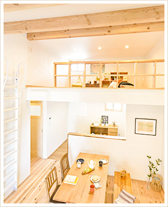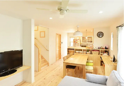 得意なデザインは、どこか懐かしさを感じるカントリースタイル。木の温もりを感じられる空間を創出します。また、エコで快適な床下冷暖房「はるかぜ」を導入しています。空気が自然に循環し、夏は床下から涼しい空気が家全体に行き渡るので快適に過ごせます。冬は逆に温かい空気がゆっくりと上昇して室内を包み込むため、一年を通して快適な住環境を実現可能です。ワンフロアに何台もエアコンを設置する必要がなく、とても経済的です。