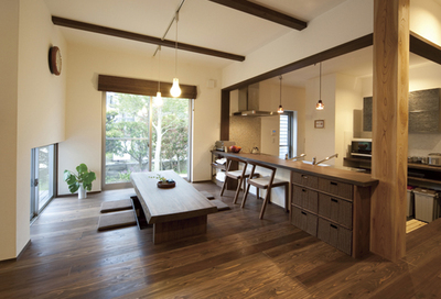 自然素材を活かした和モダンなスタイルが得意な工務店です。無垢材や漆喰といった素材を使用することで、ホルムアルデヒドの発生を抑え、家族の健康を守ります。また、軒をしっかりと出す設計により、夏は直射日光を遮って室内の温度上昇を抑え、冬は低い角度の太陽光を室内へ取り込み、暖かく心地よい空間をつくる工夫も行っています。