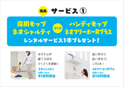 ①吸着剤つきモップ一本無料レンタル(床用モップまたはハンディモップ)