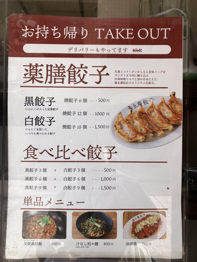 こだわりの薬膳餃子は持ち帰りが可能。白餃子と黒餃子を食べ比べできるお得なセットもあるので、ご家族やご友人同士で注文するのもいいでしょう。
