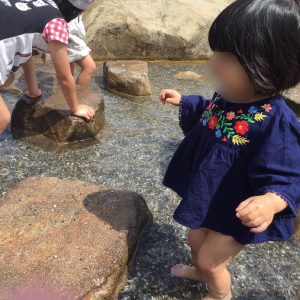 この写真は娘が2歳半のときのものです。もともと水遊びをする予定ではなかったので、水着は持ち合わせていませんでした…。ですが、周りは服のまま遊んでいる子もたくさんいたので、娘ももちろん遊びたがり、服とパンツのみで遊びました!足をちゃぷちゃぷする程度のため、服もそこまで濡れません!(近くにいた男の子は全身びしょ濡れになっていましたが…笑)