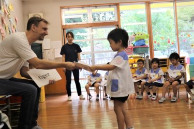 レッスンの様子を見ていると、声を出したり身体を動かしたりする“動”、静かに話を聞く“静”、全員のタイミングがピタッとそろっていることに気づいた私たち。授業中の子どもたちに、とってもメリハリを感じるんです。これは、すぐにできるものじゃないはず…!きっと普段の幼稚園生活の中で、しっかりと身についてきた力なんですね♪