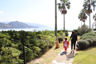 広島なだ万の人気の理由のひとつが、お店のどの席からも一望できる絶景。もちろん、個室の大きな窓からも、きれいな海が見渡せます。「お船だ~」「宮島が見えるね」とくみちゃんもママも興味津々!