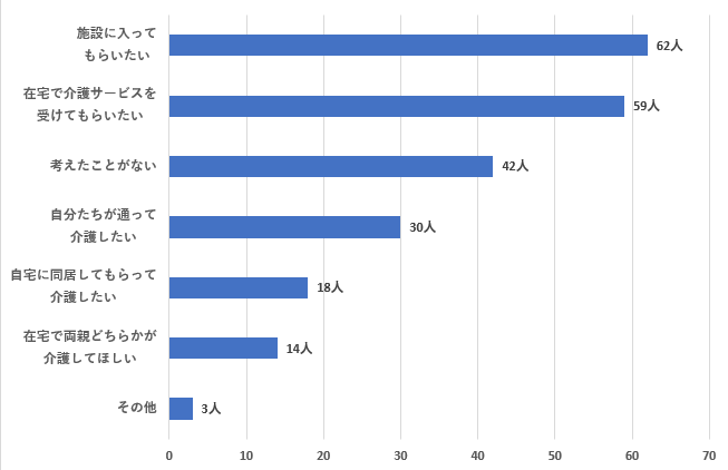 「施設に入ってもらいたい」「在宅で介護サービスを受けてもらいたい」という意見が多く、介護では家族以外の力を借りることを念頭に置いているママが多いようです。