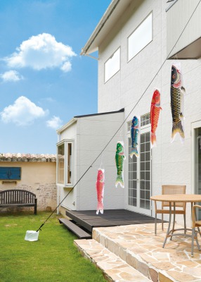 こちらは屋外用鯉のぼりの「吉祥天鯉(きっしょうてんこい)スタンド付ホームセット」。水袋の重しとポールスタンド付きなので、マンションやアパートのベランダにも設営OK。