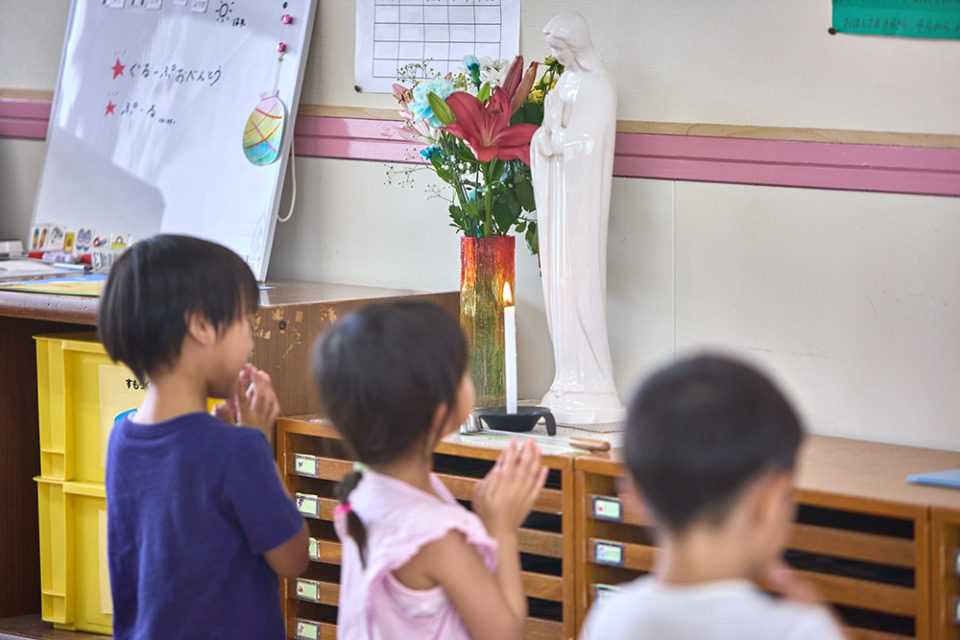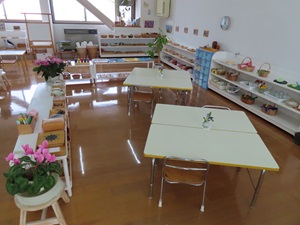 1958年に開設した『福山暁の星幼稚園』は、1976年よりモンテッソーリ教育法を全面的に導入したカトリックの幼稚園です。カトリック教育、モンテッソーリ教育、縦割り混合保育を中心とした教育を推進しています。基本的には異年齢の縦割りクラスで構成されていますが、音楽や絵画、体操や英語など同年齢で行う活動もあるようです。