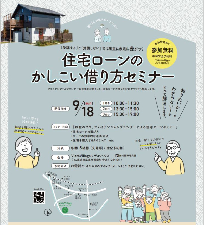 東広島市西条にあるVistaVillageモデルハウスで開催されるのが、「住宅ローンのかしこい借り方セミナー」。マイホーム購入を考えるときに一番大切な「お金」についての疑問や不安を解決できるセミナーです。受講すればきっと、マイホーム購入がまた一歩現実に近づくはず♪定員は各回先着5名なので、お申し込みはお早めに。