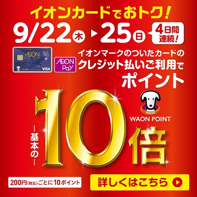 9月16日(金)から19日(月)までの4日間は、イオンクレジットカードでのお買いものがお得に!対象専門店限定で、イオンマークのついたクレジットカードでのお買いものが10%OFFになります。イオンカード登録済のイオンペイ払い・イオンJMBカードも対象です。