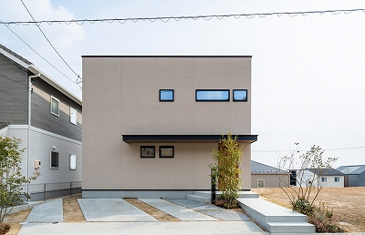 個性的なデザインがとってもおしゃれなモデルハウス。キューブ型の外観に庇(ひさし)がアクセントになっています。