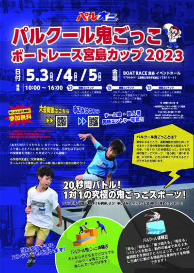 『ボートレース宮島』にて、パルクール鬼ごっこ大会が初開催されます。5月3日(水・祝)と5日(金・祝)は、事前予約不要で誰でも参加可能な体験会、4日(木・祝)は事前エントリー制の「パルクール鬼ごっこボートレース宮島カップ2023」が開催予定です♪