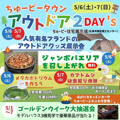 『ちゅーピー住宅展示場』では5月6日(土)・7日(日)の2日間アウトドアなコンテンツを体験できるイベントを開催♪6日は、モデルハウス1棟を見学すると手作りのジャンボパエリア食べられます!7日は昆虫大好きキッズ必見の、カブトムシの幼虫掘り体験が開催されます。参加費200円で、掘り出した幼虫1匹をもらって帰れるので、「この夏はおうちでカブトムシを飼育したい!」というご家族にぴったりです。ふわふわドームやキッチンカーなども楽しめるので、ぜひ訪れてみてください♪