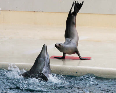 日本では珍しいイルカとアシカがコラボしたショーは必見!そのほか、魚のエサやり体験や「イルカタッチ」など、さまざまな体験もできますよ。※体験イベントは時期により休止の可能性があります。