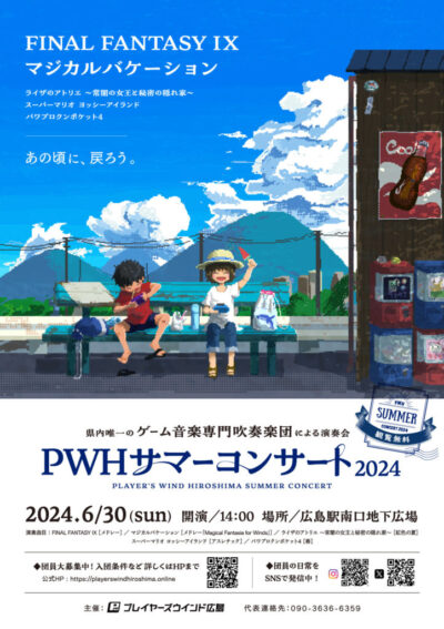 ゲーム音楽を専門としている吹奏楽団「プレイヤーズウインド広島」による「PWHサマーコンサート2024」が、30日(日)に開催!場所は、『広島駅南口地下広場』です。マリオやファイナルファンタジーなど、人気ゲームの音楽を生演奏で聴いてみませんか?子供と一緒に「この音楽、聴いたことある!」と盛り上がること間違いなしです♪