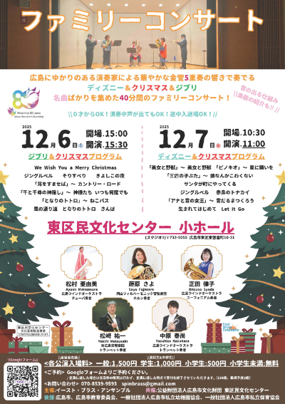 広島にゆかりのある演奏家5人による金管五重奏のコンサート。12月6日(土)はジブリ&クリスマス、12月7日(日)はディズニー&クリスマスというプログラムです。子どもにもなじみがあるジブリやディズニーの楽曲は、ノリノリで楽しめること間違いなしですね♪金管楽器の音色に酔いしれながら、クリスマス気分を味わえるコンサートです。