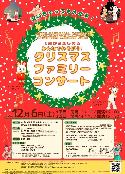 安芸高田市から生まれたユニット「AKT36 KAZU&MAI」に加え、歌のお姉さんやネコのミケちゃん、サンタクロースなど、たくさんのメンバーが登場するコンサートです。0歳から楽しめるクリスマスコンサートは、毎年大盛況。今回も、「あわてんぼうのサンタクロース」やクリスマスオリジナルメドレーなど、クリスマス気分が盛り上がるナンバーが目白押しです。