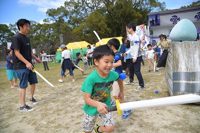 トークショーのあとは、家族みんなで参加できる「チャンバラ合戦」が実施されます。当たっても痛くないよう工夫されたスポンジ製の刀を手に、腕につけたカラーボールを狙うアクティビティ。