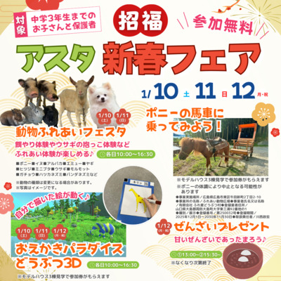お正月明けの1月10日(土)~ 12日(月・祝)は、『牛田住宅情報スクエア [アスタ]』で「アスタ新春フェア」へ参加してみませんか?メインイベントは、「動物ふれあいフェスタ」♪大人気のポニー馬車体験や、アルパカやミニブタへのエサやり体験など、さまざまな動物とふれあいを楽しむことができますよ。その他には、お子さんが描いた動物のイラストが3Dになって動き出す「おえかきパラダイスーどうぶつ3Dー」も!素敵なプレゼントが当たる新春抽選会もあるので、ぜひ家族で訪れてみてください。