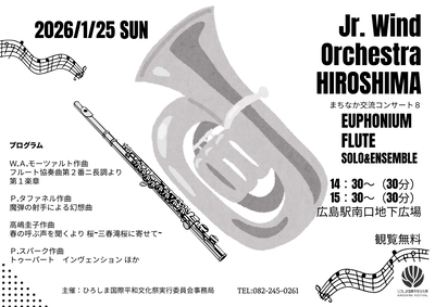 1月25日(日)、『広島駅南口地下広場』では、「まちなか交流コンサート1月公演」が行われます。音楽を学ぶ中高生を対象とした「ジュニアウインドオーケストラ広島」から選抜されたサックスパートによるコンサートです。約30分間の演奏を無料で聴くことができるので、お子さんにとって気軽に音楽に触れられるチャンス!お買い物などで広島駅を訪れた際は、美しい音色に耳を傾けてみてください。