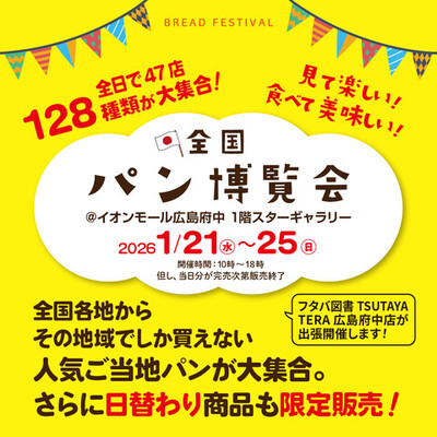 パン好きさんは、『イオンモール広島府中』に集まれ♪1月21日(水)~25日(日)は、全国各地から人気のご当地パンが大集合する「全国パン博覧会」が行われます。イベント期間全日で47店舗が出店し、約128種類のパンが販売されますよ。日替わりパンも限定販売されるので、お気に入りのパンを見つけてみましょう。会場への入場には整理券が必要。各日朝9:00~整理券が配布されるので、お目当てのパンを確実にゲットしたい方は、早めに来店するのがおすすめです。