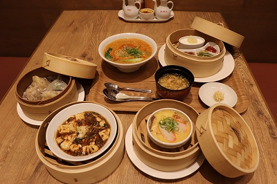 こちらは、人気メニューの「五福の蒸篭かさね膳」。メインは担々麺か台湾まぜ炒飯の2種類から選べて、小籠包や焼売の他、前菜盛り合わせ、麻婆豆腐や台湾風あんかけ茶碗蒸し、スープ、デザートまで盛りだくさんの内容です。