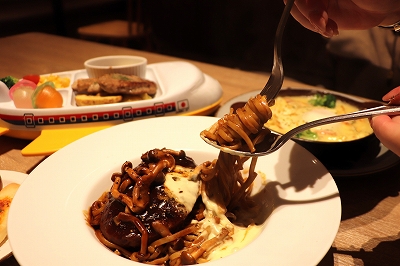 こちらは「ハンバーグが乗ったデミチーズパスタ」。ボリューム満点で、濃厚なデミソースとチーズがたまらない一品です。