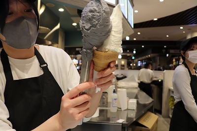 一番人気は、ピュアミルク。こちらは、ピュアミルクと竹炭きなこのダブルコーン。