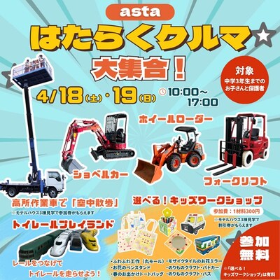 乗り物が大好きなお子さんに朗報です。4月18日(土)・19日(日)は、東区牛田にある『牛田住宅情報スクエア [アスタ]』で「アスタはたらくクルマ大集合」を開催!ショベルカーや高所作業車といったかっこいい乗り物が登場します。今回のイベントでは、はたらくクルマの運転席に乗ったり、一緒に写真を撮ったりできます。そのほか、選べるワークショップやトイレ―ルプレイランドなど、ワクワクコンテンツが盛りだくさん♪モデルハウスを見学がてら、お子さんとお出かけしてみてください。
