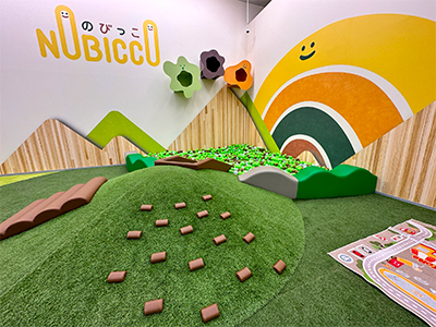 人工芝の中にある丘を登ったり、滑り台で遊んだりできる「芝生の丘」や、さまざまな種類のごっこ遊びを楽しめる「なりきりタウン」が魅力。さらに、知育おもちゃも豊富にそろっているので、指先を使ったり頭を働かせたりして遊ぶことで、考える力も養われます。