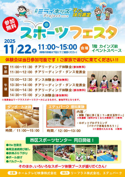 『LECT』では、11月22日(土)に「スポーツフェスタ」を開催。午前・午後でチアリーディングやダンスの体験会が行われます。その他、ダンボール迷路や理科実験など、子どもの“ワクワク”を引き出せるおもしろイベントがたくさん!『西区スポーツセンター』では、鉄棒ぶら下がりやボール投げなどのスポーツ体験も実施されていますよ。「子どもがスポーツ大好き!」「いろいろなスポーツを体験させたい!」というパパ・ママは、ぜひ参加してみてください。